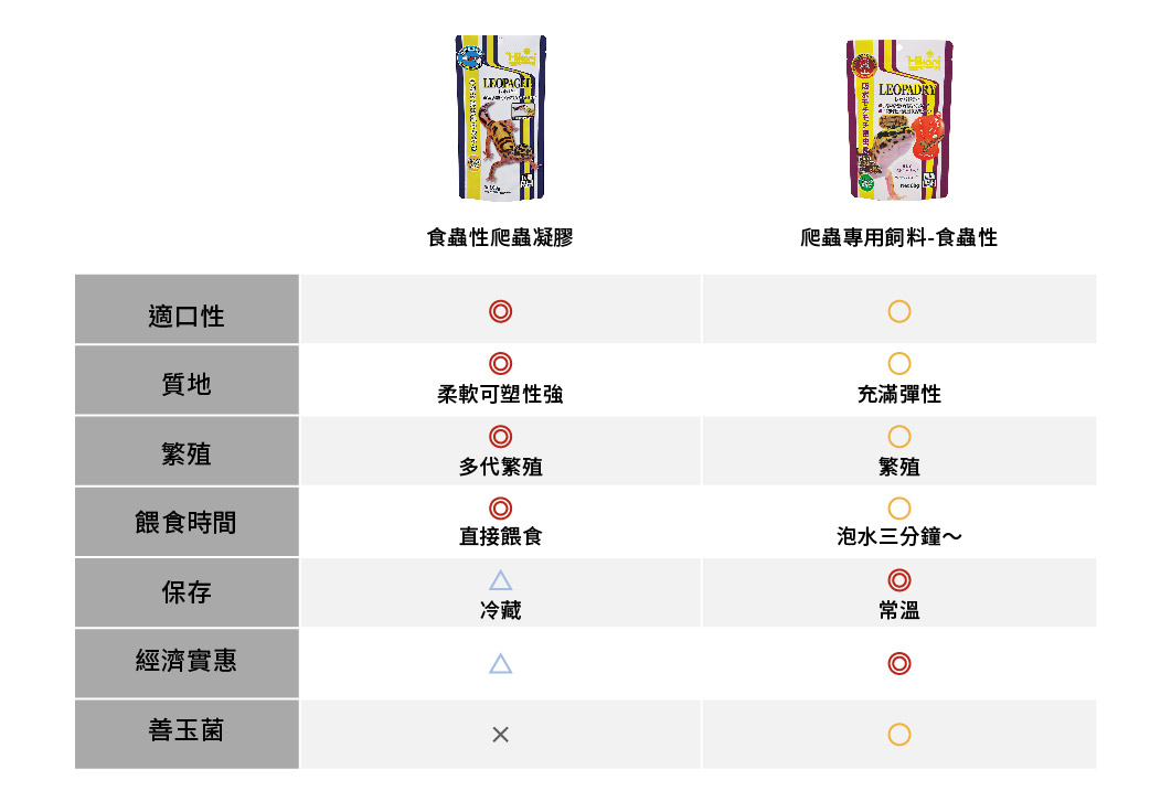 食蟲性爬蟲凝膠及食蟲性爬蟲專用飼料的比較