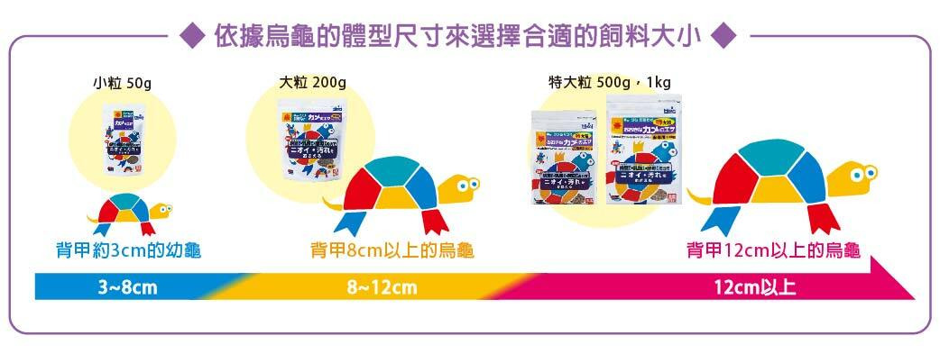 3. 小烏龜使用小顆粒餵食,甲殼長度約10公分的烏龜使用大顆粒,12公分以上的烏龜使用特大顆粒,請配合烏龜的成長給予合適的飼料。
