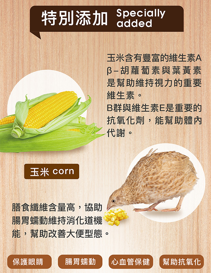 玉米、大豆粕、脫脂牛奶粉、益生 菌、維他命、維生素E、鈣粉、植物性植物 油、杮子萃取物