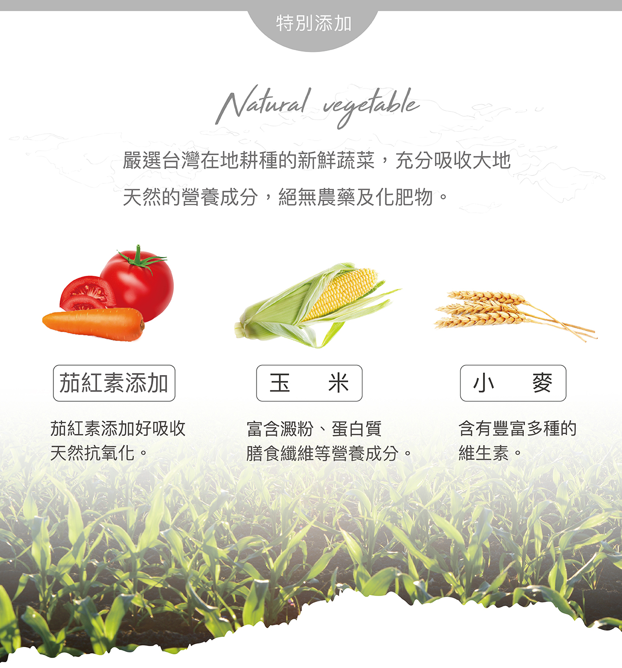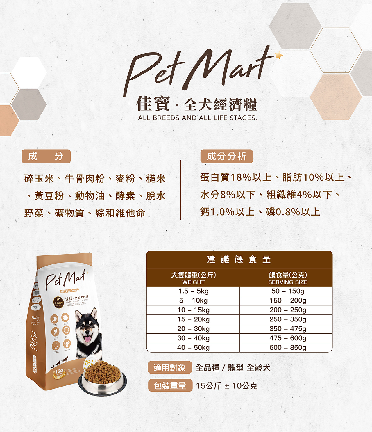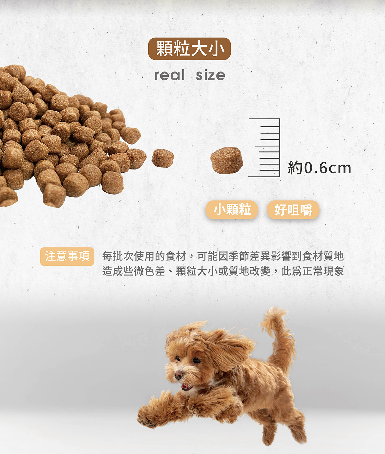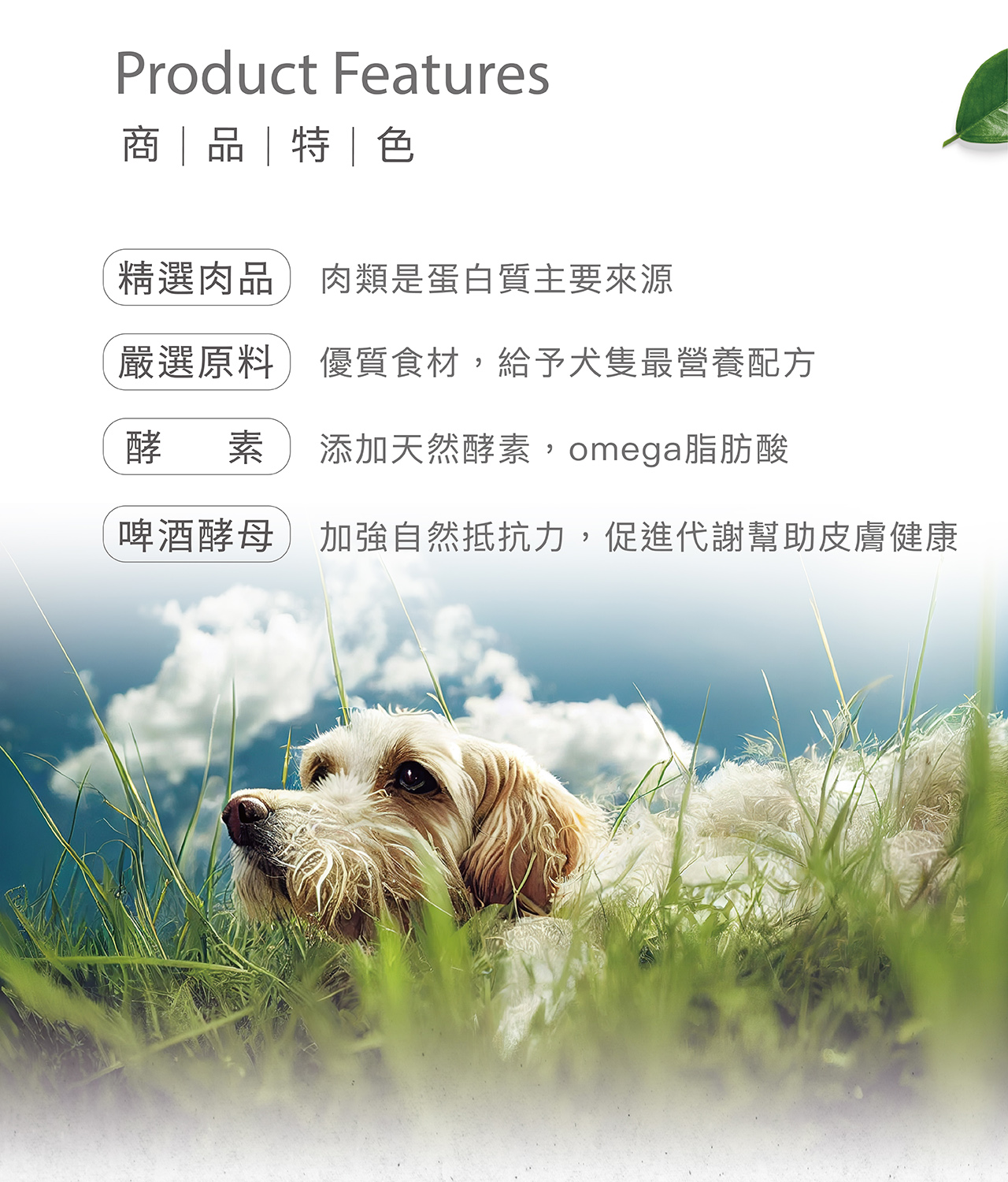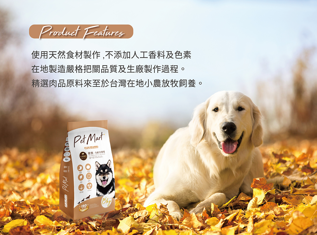 碎玉米、牛骨肉粉、麥粉、糙米、黃豆粉、動物油脂、啤酒酵母、脫水野菜、酵素、礦物質、綜合維他命
